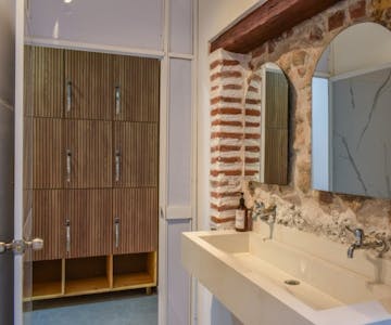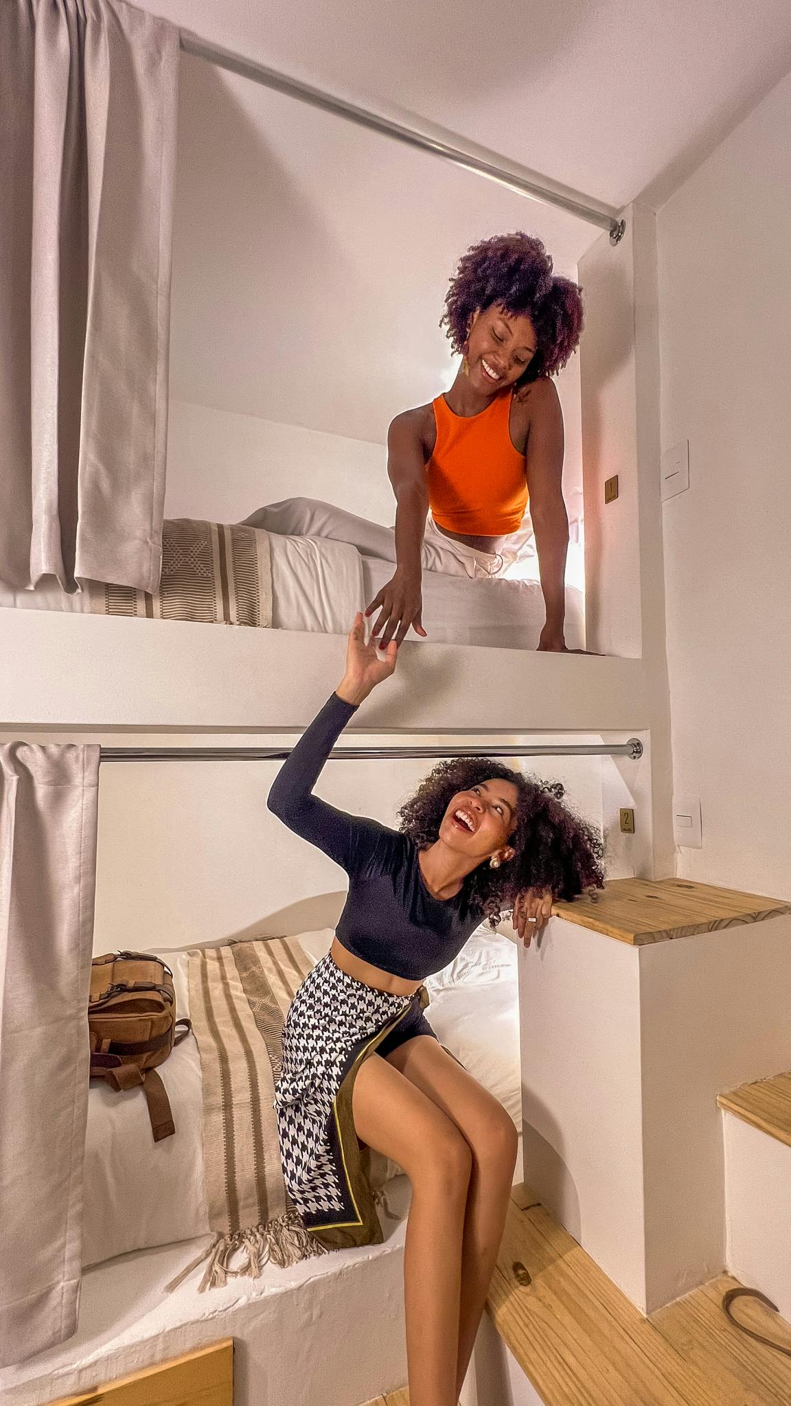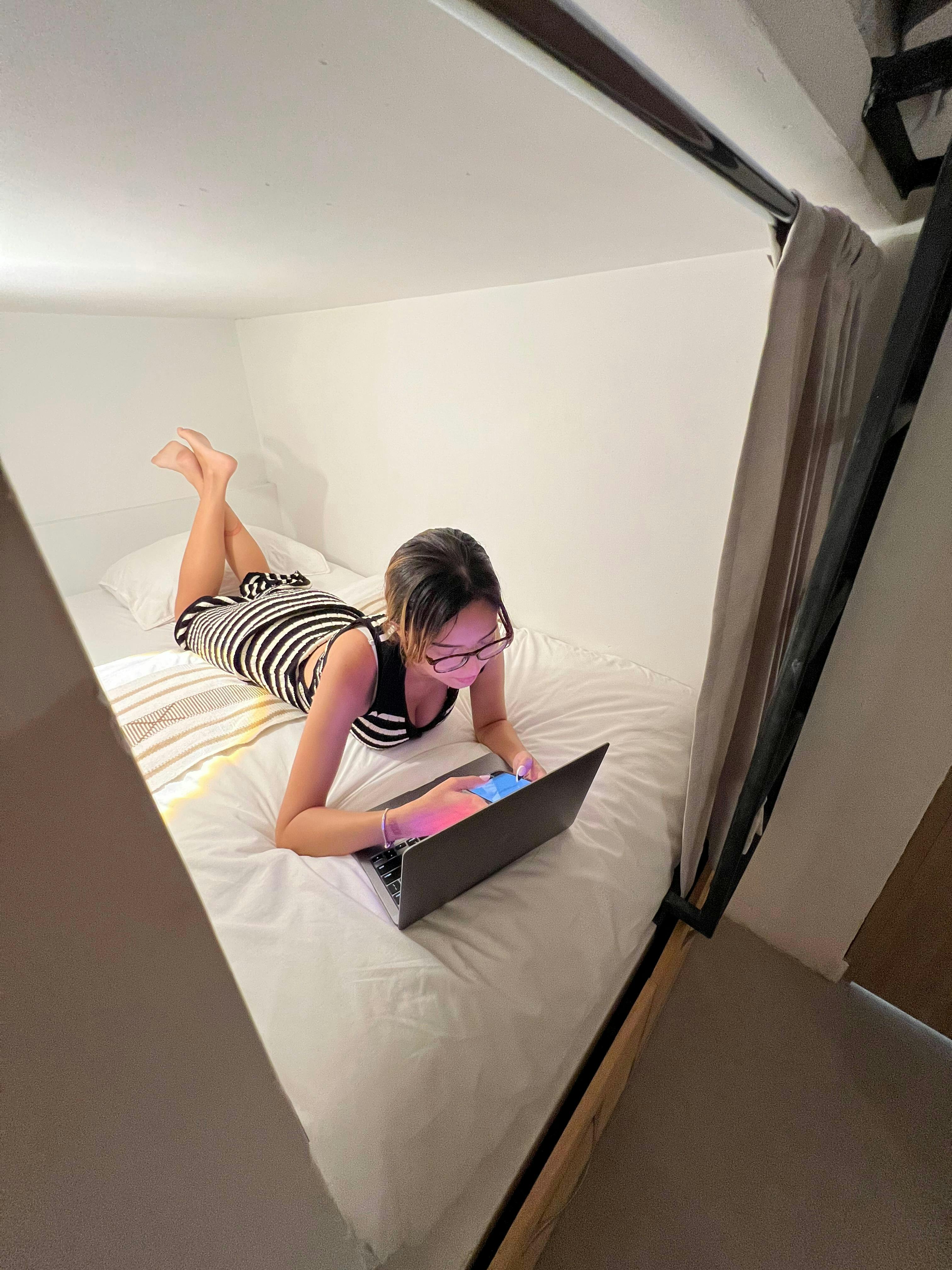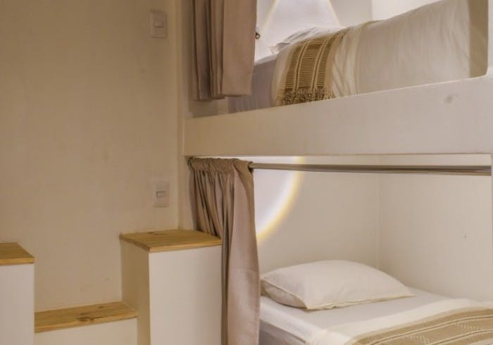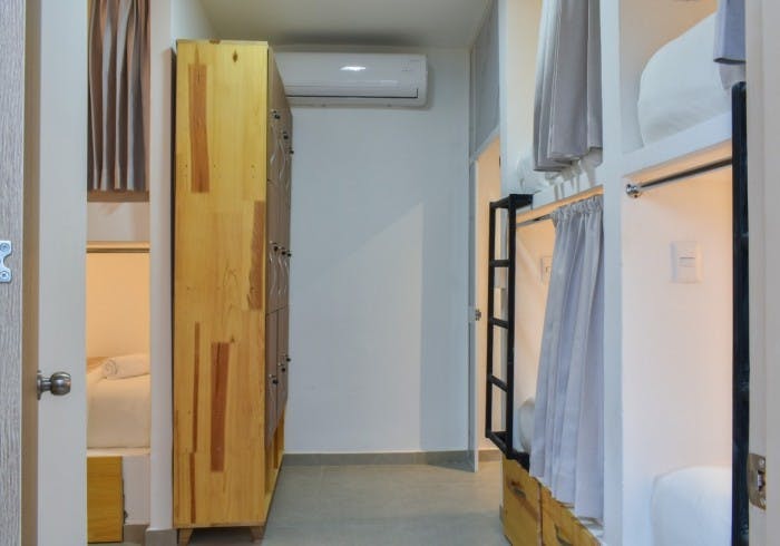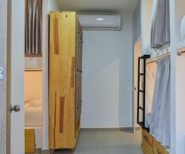 Shared female dormitory with private bathroom, LED reading light, privacy curtains, and lockers with security keys, located on the first floor of the property.